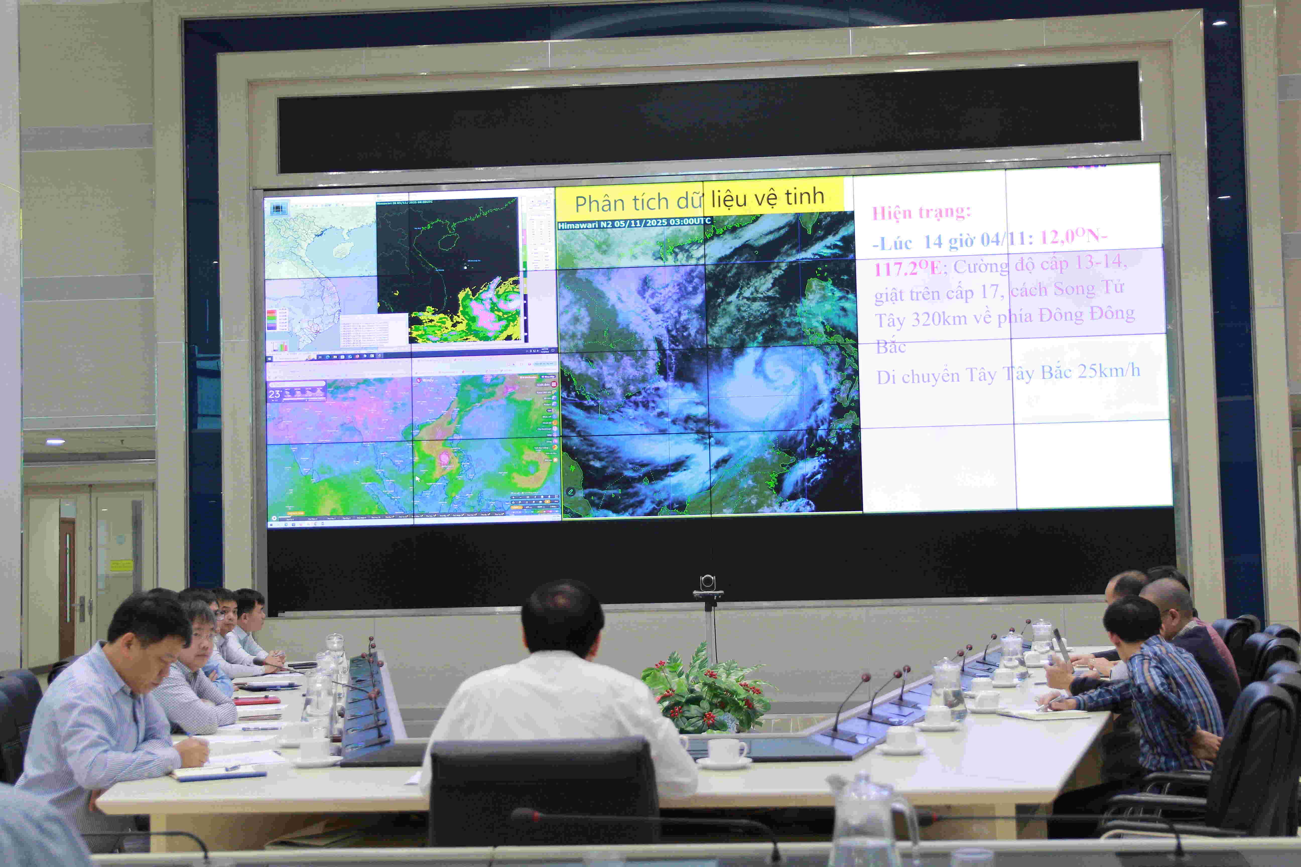 Toàn cảnh cuộc họpBáo cáo tại cuộc họp, Ông Nguyễn Văn Hưởng, Trưởng phòng Dự báo thời tiết, Trung tâm Dự báo KTTV quốc gia cho biết: hồi 16 giờ ngày 05/11, vị trí tâm bão số 13 ở vào khoảng 12,1 độ Vĩ Bắc; 117,0 độ Kinh Đông, cách đảo Song Tử Tây khoảng 300km về phía Đông Đông Bắc, cách Quy Nhơn (Bình Định) khoảng 880km về phía Đông Đông Nam. Sức gió mạnh nhất vùng gần tâm bão mạnh cấp 14 (150–166 km/giờ), giật cấp 17, di chuyển theo hướng Tây Tây Bắc, tốc độ khoảng 25km/h.