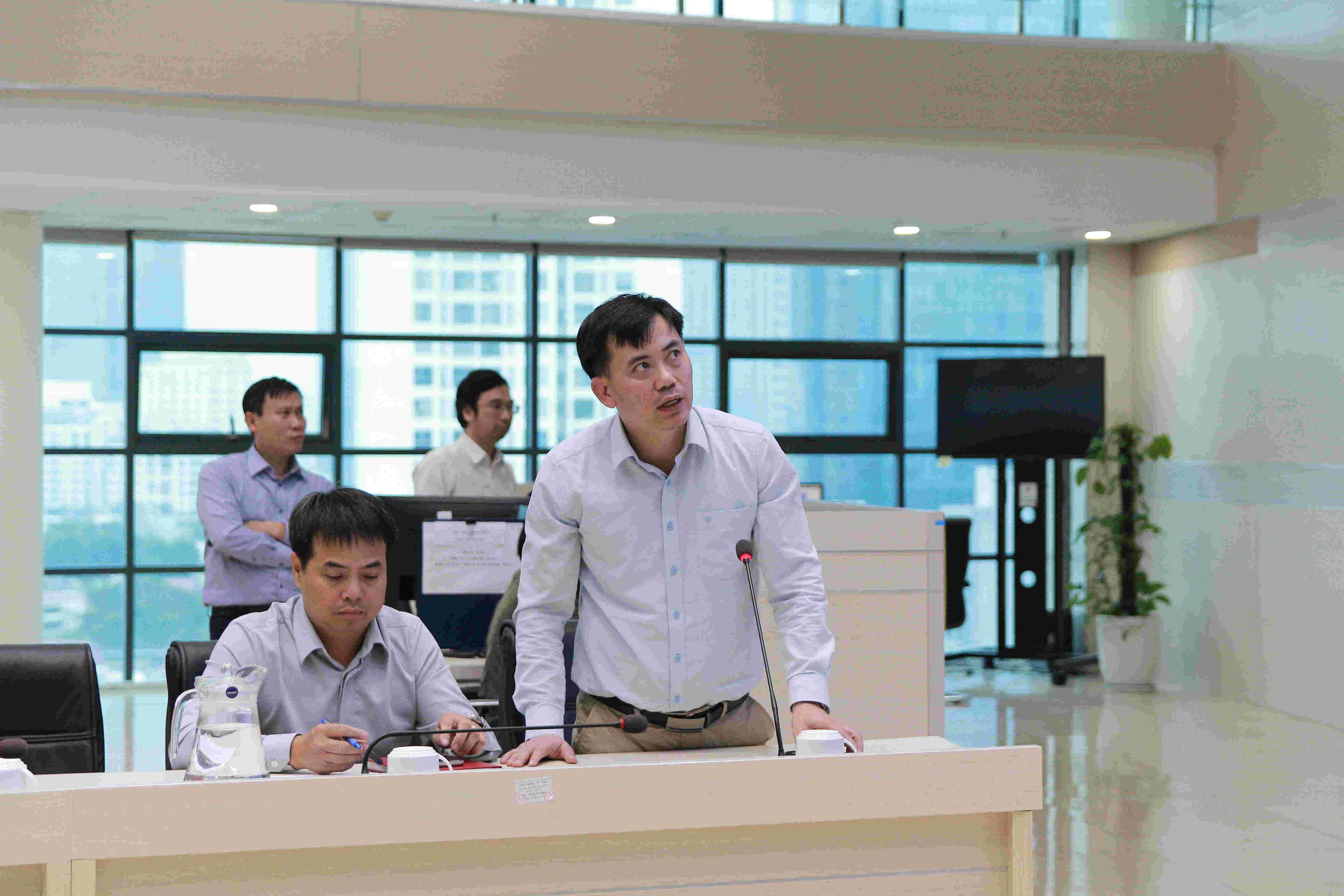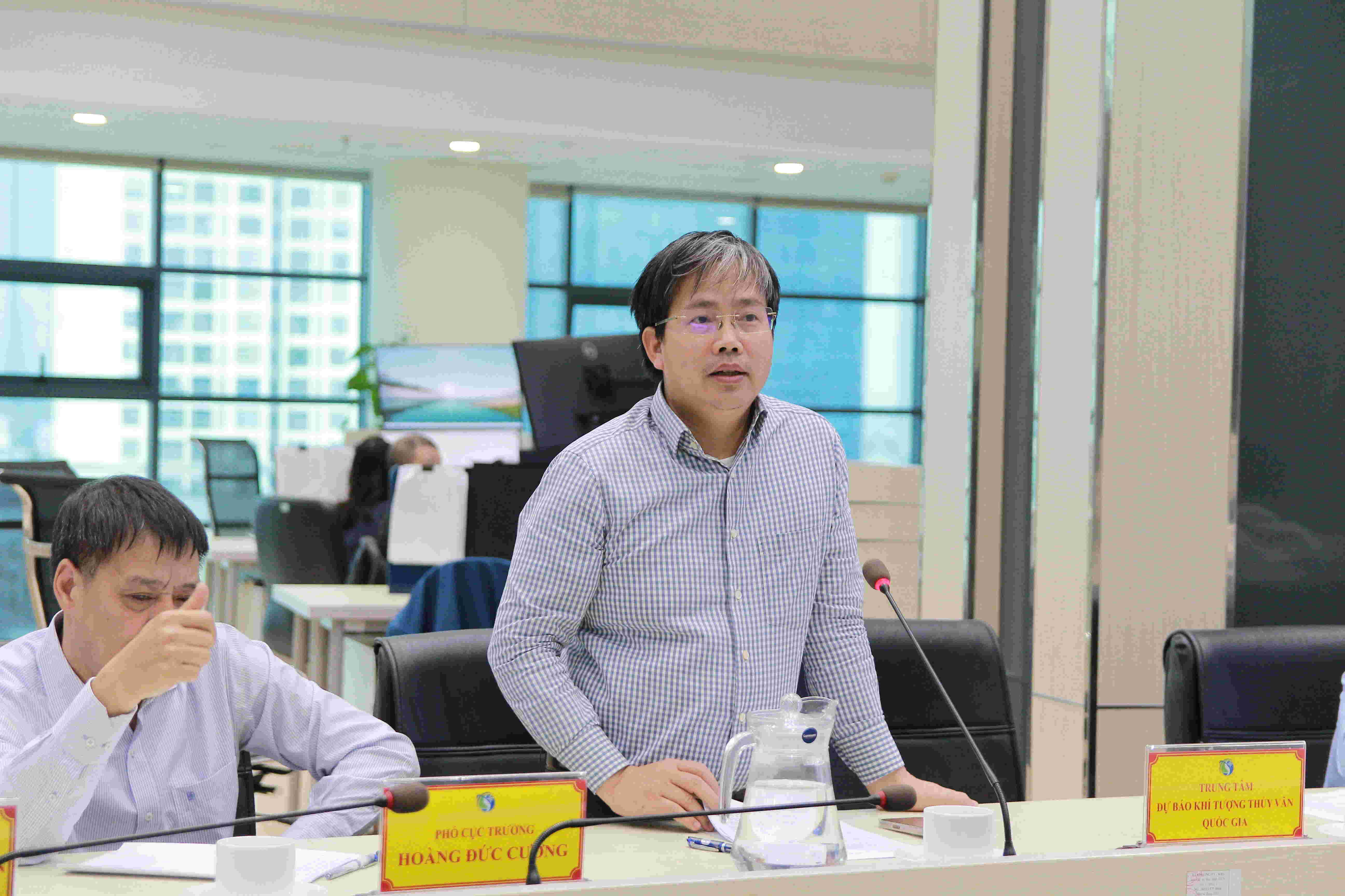 Ông Nguyễn Văn Hưởng, Trưởng phòng Dự báo thời tiết, Trung tâm Dự báo KTTV quốc gia báo cáo tại cuộc họpSóng lớn và triều cường có thể xuất hiện trước khi bão vào